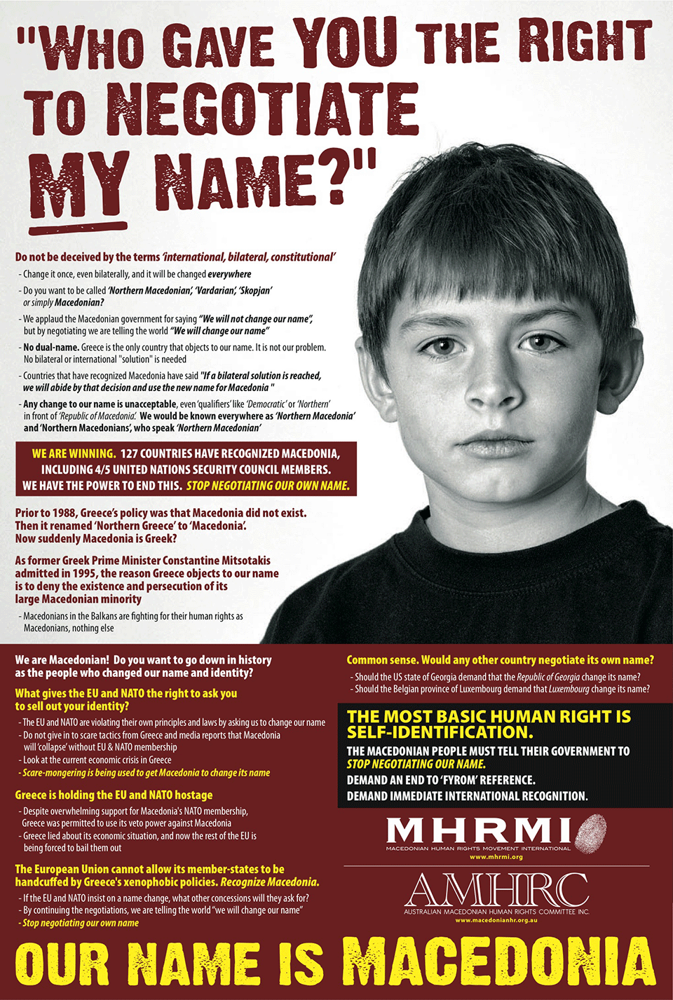 Macedonian Human Rights Movement International (MHRMI) and the Australian Macedonian Human Rights Committee (AMHRC) have launched an ad campaign in the Republic of Macedonia demanding an end to all negotiations with Greece over its name.