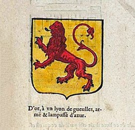 | Припишаниот грб на Александар Велики, од грбовникот на Жером де Бара, со текстот кој што стои над него |
